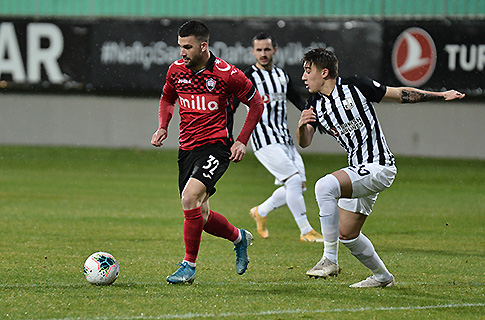 Matçın ilk yarısı qarşılıqlı hücumlarla keçib. Oyunun əvvəlində Ştefan Vukçeviçin qapı istiqamətinə zərbəsi istənilən kimi alınmayıb. Sağ cinahdan cərimə meydanına daxil olan Asif Məmmədovun iti bucaq altından endirdiyi zərbədən sonra top qapının üstündən keçib. Müdafiədə etibarlı oynayaraq rəqib hücumlarının qarşısını alan “qırmızı-qaralar” bir neçə qol imkanı qazanıb. Cinah ötürməsindən sonra Murad Musayevin yaxın məsafədən başla topa toxunuşu hesabın açılması üçün yetərli olmayıb. Az sonra Nikolas Rayselin ötürməsi zamanı uzaq dirəyin önündə olan Asif Məmmədovun zərbəsinin qarşısını rəqib qapıçı alıb.